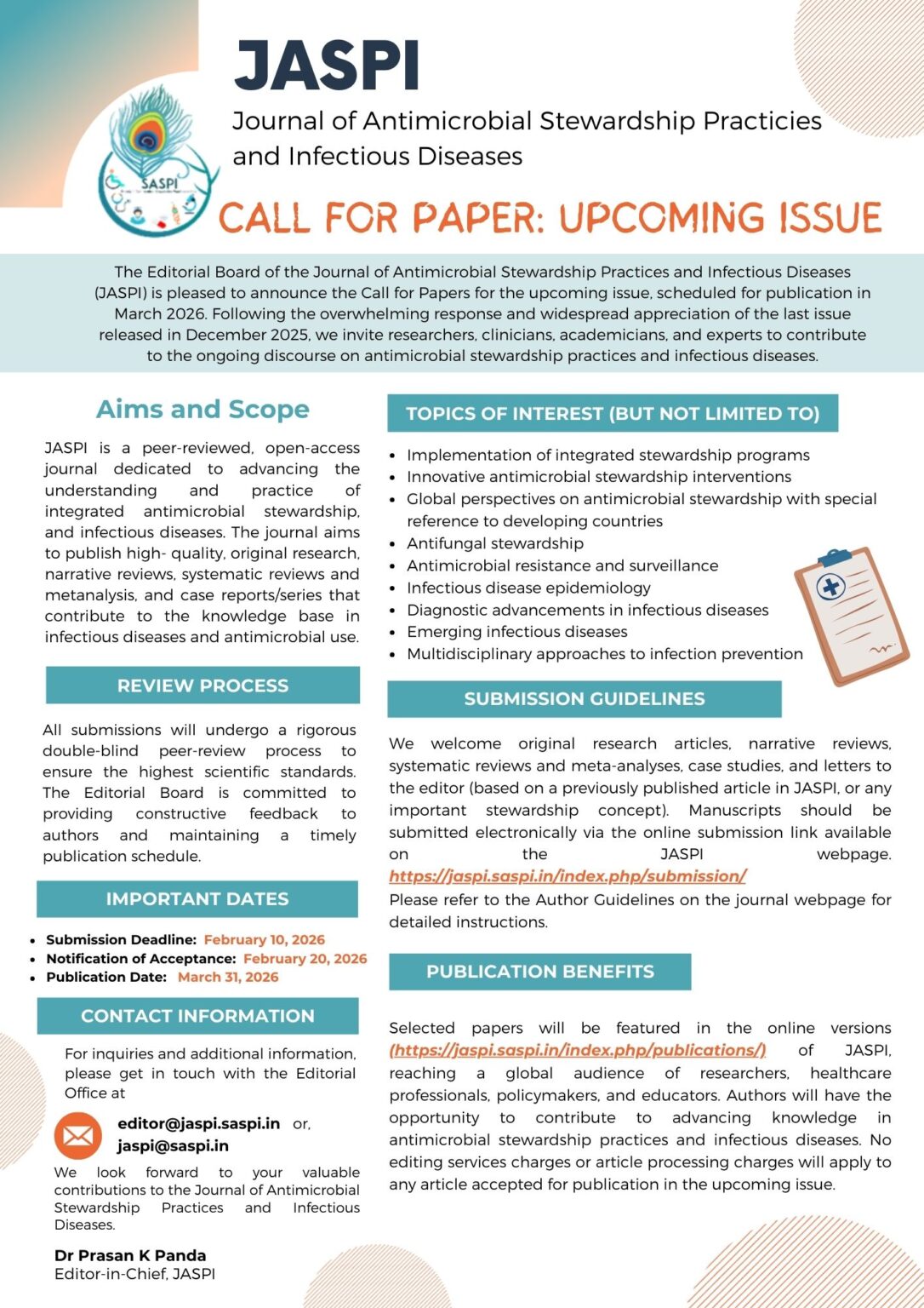 The Editorial Board of the Journal of Antimicrobial Stewardship Practices and Infectious Diseases (JASPI) is pleased to announce the Call for Papers for the upcoming issue, scheduled for publication in March 2026.